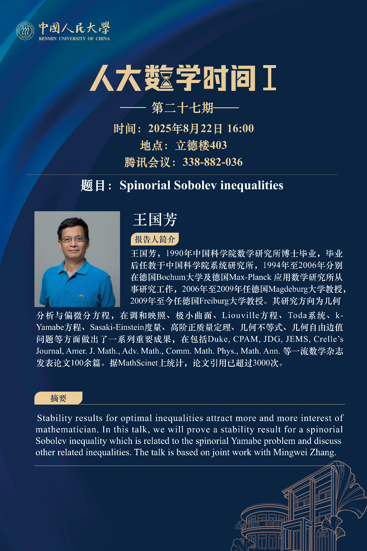 为促进学科交流融合、拓宽师生学术视野、释放科研创新活力,助力人大数学学科走向一流,中国人民大学设立“人大数学时间”,以专题研讨、高端学术论坛为载体,搭建数学思想充分碰撞、优秀人才不断涌流、创造活力竞相迸发的舞台。“人大数学时间”将持之以恒,久久为功,立志通过交流与创新、提出重大问题,引领数学学科及相关领域的创新与发展,成为对我国数学发展有贡献意义的平台。以下为“人大数学时间I”第二十七期信息: